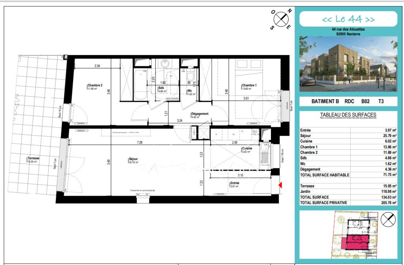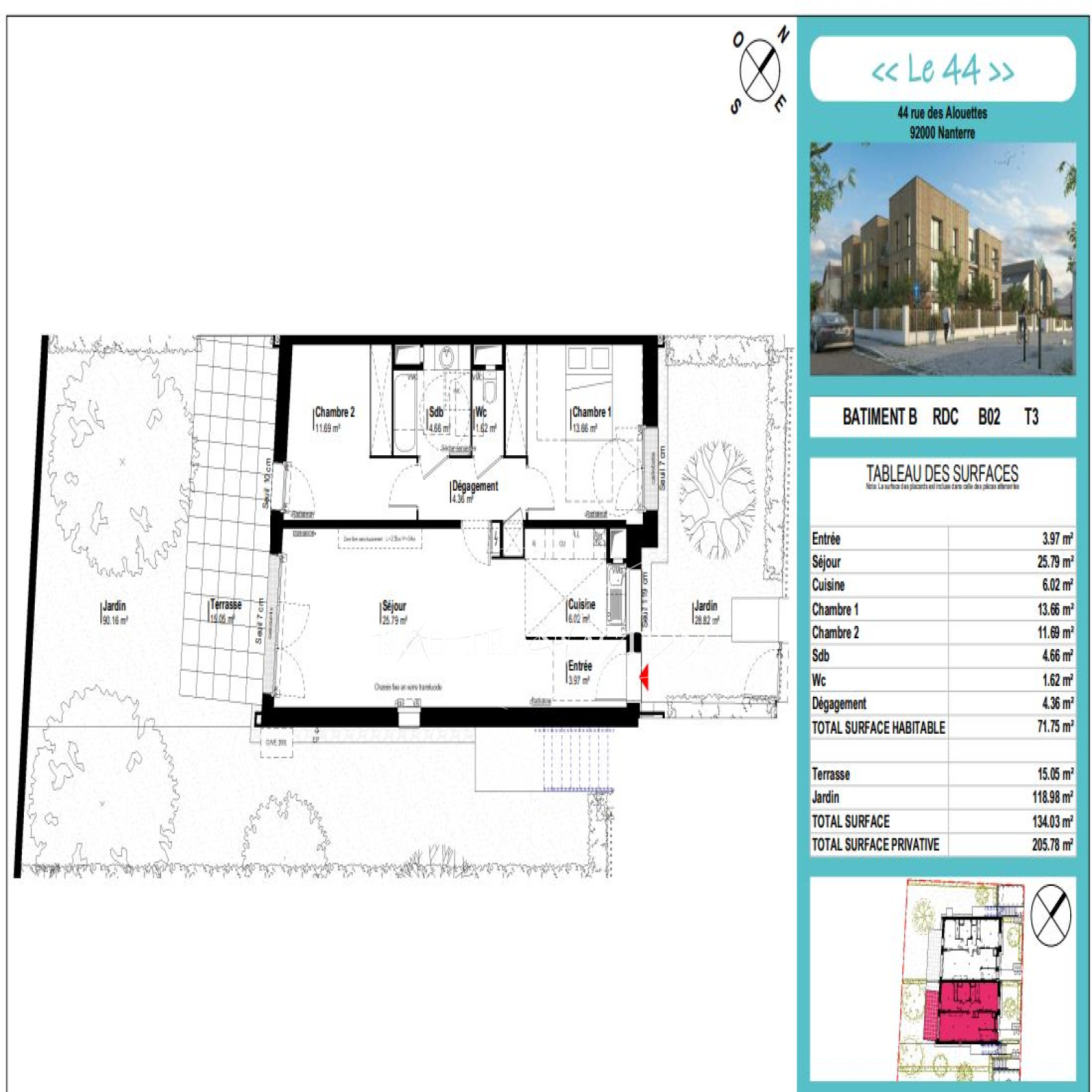 Plateau du Mont-valérien, au sein d'un quartier calme et pavillionnaire, à proximité des commerces et transports ( RER et bus) , un appartement neuf ( livré au 31 mars 2023) traversant ( Est/Ouest) de 3 pièces en rez- de- chaussée, telle une maison avec son entrée particulière, composé d'une séjour avec cuisine ouverte s'ouvrant sur une terrasse de 15 m2 et d'un jardin de 119 m2, de deux chambres, d'une salle de bain et WC séparé. Résidence répondant aux normes thermiques RT 2012 et sécurisée ( digicode, visiophone) . Un parking en sous-sol complète le bien. Local vélo. Copropriété à taille humaine de 14 appartements de 3 niveaux . Pas de procédure en cours. Garantie décennale. Prix 544 000 frais d'agence inclus dont 5% d'honoraires à la charge de l'acquéreur.